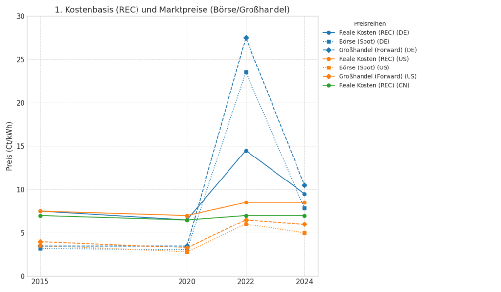Zur Vorbereitung einer Veranstaltung habe ich meinem Markenkern folgend einige visuell hochwertige Bleiwüsten zum Vergleich der Strommärkte Deutschland, USA, China zusammengestellt. Kernergebnisse: – Die Produktionskosten von Strom waren vor der Ukraine-Krise global ähnlich. Kein relevanter Nachteil für Deutschland. Bestimmender Faktor