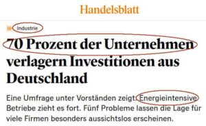 Das medial/journalistische Lowlight des Tages liefert das Handelsblatt. Erbärmliches Clickbaiting, kommt in die nächste Vorlesung. Fette Aufmachung: „70% der Unternehmen verlagern Investitionen aus Deutschland“. Das dürfte bestens klicken. Begrifflich geht da natürlich alles wild durcheinander. Oben steht „Industrie“, dann folgt