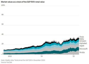 Ein nur scheinbar komplexes Bild, das sehr schön aus Hubschrauberperspektive auflöst, was sich in Sachen KI derzeit in der Wirtschaft und an den Kapitalmärkten tut. Die kleinen Markierungen rechts zeigen die Entwicklung der sogenannten Magnificent 7, die verkürzt inzwischen als die großen KI-Werte bezeichnet werden sowie den US-Gesamtmarkt exklusive dieser. Die weiteren Linien sind die einzelnen Mag7. Wesentliche Erkenntnisse: –