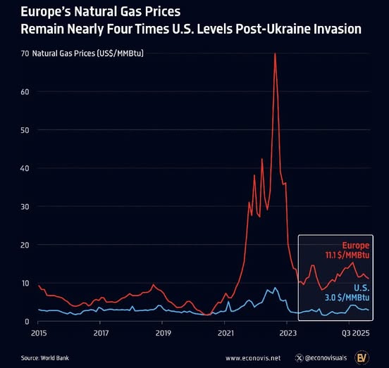 Wer das Thema mit den Energiepreisen und der Wettbewerbsfähigkeit verstehen will, kann das mit dem beigefügten Chart am besten erreichen: Der Gaspreis lag historisch viele Jahre zwischen den USA und Europa auf ähnlichem Niveau. Seit dem Ukraine-Krieg hat sich das