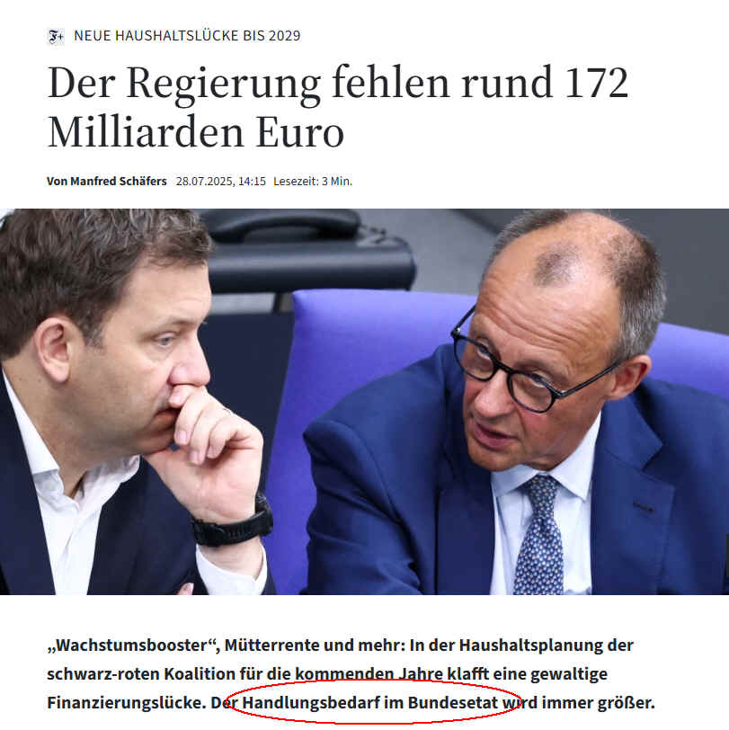 Das wäre alles nicht wirklich tragisch, denn die Substanz reicht noch, wenn man die erkennt: Das ist nämlich die Fähigkeit Deutschlands, rasch und signifikant, Schulden aufzunehmen. Das wiederum hat etwas mit dem Euro zu tun, mit modernen Notenbanken, mit einem Geldsystem, in dem viel Liquidität gute Anlagen sucht, die Deutschland (noch) zu bieten hat. Des einen Schulden sind nämlich des anderen Geldanlage.