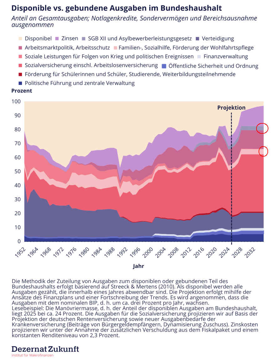Man erkennt unschwer, dass die disponiblen Mittel verschwinden, weshalb das DZ zurecht darauf hinweist, dass die Schuldenbremse dringend zu reformieren ist. Es wird nämlich ohne steigende Verschuldung nicht gehen und in dem derzeitigen Konstrukt bedeutet das bekanntlich über Sondervermögen mit 2/3-Mehrheiten ein Dauerflickwerk mit schwierigen Mehrheitsverhältnissen. Das erinnert mich sehr an die Notverordnungen aus Weimarer Zeiten, keine Option für eine funktionierende Demokratie. Wenn die Schuldenbremse nicht mehr funktioniert, weil es insbesondere im Sozialbereich gesetzliche Zusagen gibt, die dem mathematisch widersprechen, kann man nicht mehr so weiter machen. Entweder kassiert man die Schuldenbremse oder strukturiert die Sozialzusagen – und zwar für die Mehrheit der Bevölkerung, rückwirkend! Alles andere ist mathematisch unmöglich und darf daher als politische Lüge bezeichnet werden.