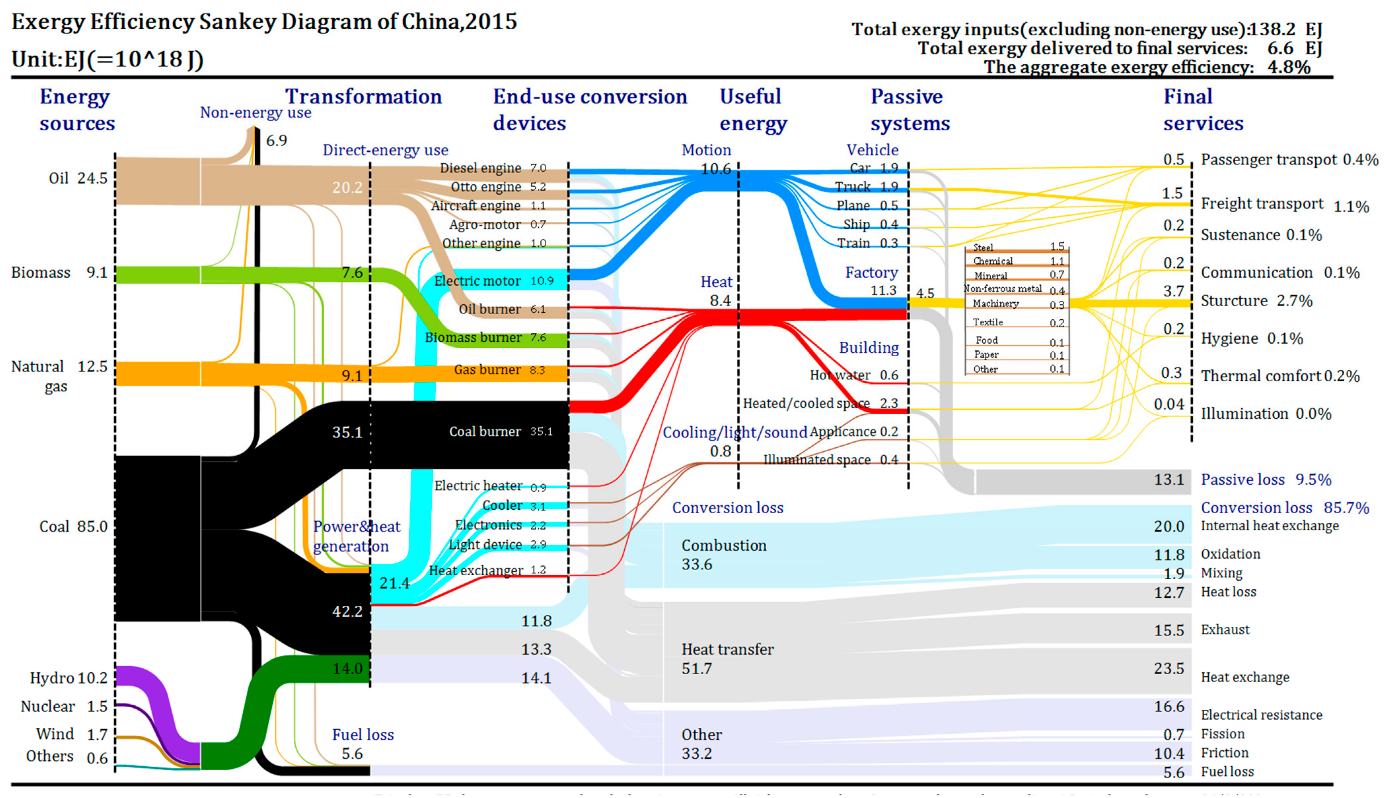 Diese Diagramme zeigen methodisch sehr ähnlich, wie diese so gerne zitierte Primärenergie als Energiefluss genutzt wird, um letztlich irgendwo Fortbewegung, Wärme, Kühlung, Produktion etc. zu ermöglichen. Die Chinesen gehen dabei – und das ist bemerkenswert – stets bis zu Exergie, die US-Daten enden bei der Nutzenergie.