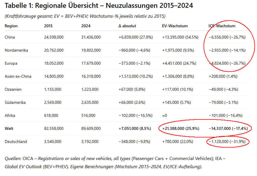 Seit 2015 ist der E-Antrieb der einzig wachsende und der Verbrenner der einzig schrumpfende. Das gilt weltweit, es gilt sogar in Deutschland. Im inzwischen größten Markt, in China, geht das am schnellsten, aber auch in den großen Volumenmärkten Nordamerika sowie Europa ist das der Fall. Die Statistik wird nur durch Indien etwas gebremst, dem vermutlich nach oder mit China wichtigstem Einzelmarkt der Zukunft. Da Indien jetzt aber ähnlich China sogar noch schneller in diese Transformation einsteigt, wird der globale Trend vermutlich beschleunigt.