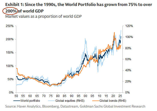 Der jüngste Report zeigt gerade im Zusammenhang mit den aktuellen KI-Investments sehr interessante Strukturen, die man als die „Drittelung“ bezeichnen könnte. Zunächst sei allen oberflächlichen Schuldenallergikern erneut klar gemacht: Das Weltportfolio hat inzwischen einen Level von 200% der weltweiten Wirtschaftsleistung erreicht (Chart1). Das passt – keinesfalls zufällig – zum Schuldenstand. Schulden sind und bleiben die Quelle jeder Wertschöpfung, mit der Nebenbemerkung, dass diese scheitern kann. Ohne Schulden geht in einer Ökonomie also gar nichts. Sie sind dabei keine Garantie für Wertschöpfung, ohne Schulden ist hingegen Erosion garantiert, beginnend übrigens bei Infrastrukturen.