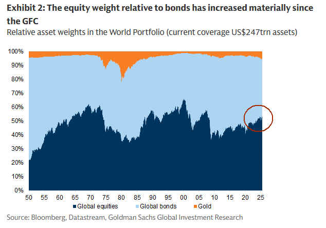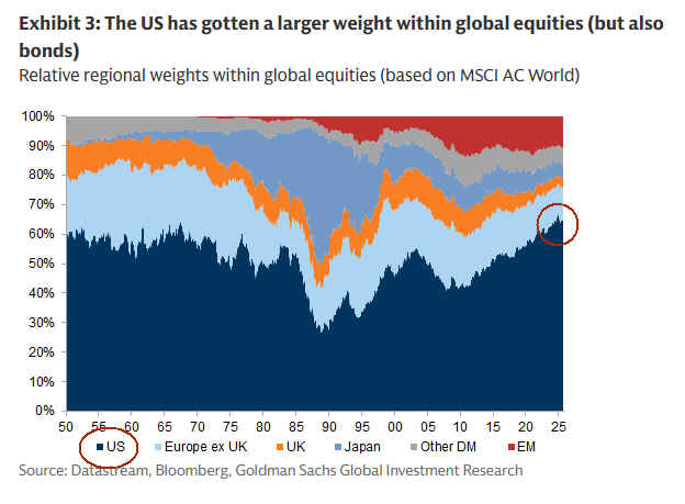 Wo liegt das Geld der Welt und was bedeutet das? Dieser Frage nähert sich eine Analyse, die Goldman Sachs seit Jahrzehnten regelmäßig macht: Das sogenannten Welt-Portfolio. Zur Einordnung: Das sind alle weltweiten Geldanlagen in Wertpapiere und Bankprodukte. Nicht enthalten sind also insbesondere direkter Immobilien-, Sachwert und Unternehmensbesitz. Das Gesamtvermögen der Welt ist insofern höher und hier nicht abgebildet.