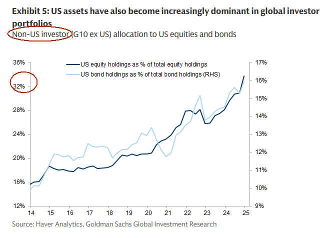 Das war bisher ein gutes Geschäft für die meisten Investoren. Es begründet aber sehr viele Nachteile für andere Regionen, insbesondere die Verfügbarkeit von Kapital für andere Unternehmen und Volkswirtschaften. Nun trifft diese Konzentration auf die USA, die viele Kleinanleger bei ihren ETFs übrigens ebenfalls vorfinden, auf eine Phase, in der viele neue Fragen auf dem Tisch liegen: Wohin entwickeln sich die USA politisch, wie geht es mit deren Finanz- und Währungspolitik weiter, nutzen sie ihre Position für erpresserische Maßnahmen oder bleiben sie ein rechtssicherer Investmentstandort für Ausländer, sind die Bewertungen der US-Werte noch realistisch, gibt es eine Bewertungsblase, kommt eine Korrektur?