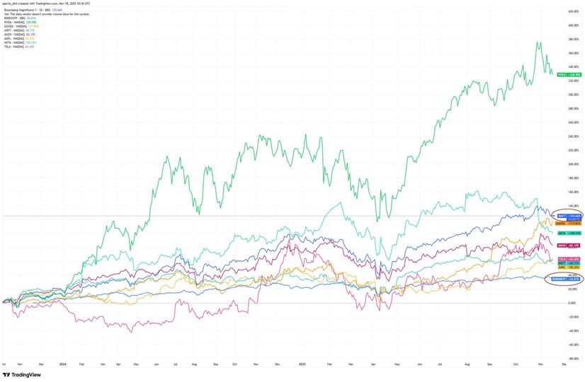 Die kleinen Markierungen rechts zeigen die Entwicklung der sogenannten Magnificent 7, die verkürzt inzwischen als die großen KI-Werte bezeichnet werden sowie den US-Gesamtmarkt exklusive dieser. Die weiteren Linien sind die einzelnen Mag7.