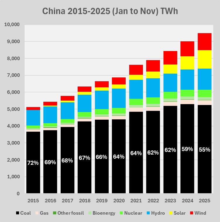 Man erkennt hier sehr gut, dass China in einem wachsenden Stromsystem den Kohlestromanteil schon lange zurück fährt, dass der nun auf 55% gefallen ist und dass der Kohlestrom jetzt auch absolut sinkt. Ebenso ist erkennbar, dass vor allem der enorme PV-Ausbau der letzten Jahre das wenig überraschend ermöglicht hat.