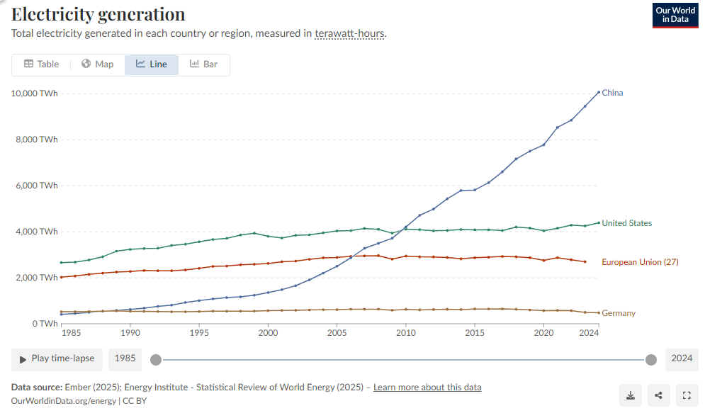 Um Stimmen zu Fortschritten in Europa zu erden, seien die Charts 2+3 erwähnt, die zeigen, in welch deutlicher Mengensteigerung China das erreicht hat und zwar ausdrücklich auch durch eine Ausweitung des Stromsystems im Gesamtenergiemix.