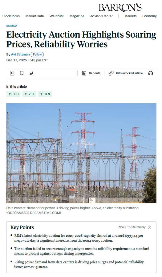 Aufgrund der Nachfrage durch KI-Rechenzentren, die noch gar nicht da ist, spekuliert „der Markt“ auf dramatisch steigende Preise. Die Anbieter haben also tatsächlich in der Auktion den zehnfachen Preis gegenüber 2024 durchgesetzt und die Kapazität reicht trotzdem noch nicht ganz.