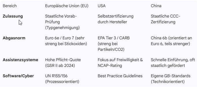USA: Anders, aber nicht weniger! Prinzip der Eigenverantwortung (Self-Certification), basiert auf den FMVSS (Federal Motor Vehicle Safety Standards). Hersteller zertifiziert selbst, dass das Auto die Regeln einhält, Behörde (NHTSA) prüft im Nachhinein durch Stichproben oder bei Unfällen. Kann dann bekanntlich SEHR teuer werden. Technologie-Fokus: Die USA sind bei passiver Sicherheit (Crash-Tests) extrem streng, bei aktiven Assistenzsystemen liberaler als die EU. Da die USA kein Mitglied des 1958er UN-Abkommens sind, weichen technische Details (z. B. Scheinwerfer-Lichtverteilung oder die Form der Außenspiegel) von EU-Standards ab. Ein „Weltauto“ zu bauen, erfordert daher für die USA schon immer separate Bauteile.