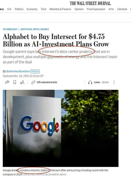 Falls diese enorm interessante Nachricht die deutschen Medien und Echokammern nicht interessiert, hole ich sie nach: Alphabet, die Google-Mutter, wird für 4,75 Mrd. Intersect Energie übernehmen. Man hält bereits eine Beteiligung, die für 800 Millionen erworben wurde, das Invest beträgt also 5,55 Mrd. Hinzu kommen die Aufträge an die neue Tochter, die sehr innovative Data-Center-Lösungen baut.
